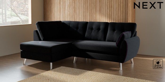7.2.10 Buy Wilson Buttoned Back Medium Corner Chaise - Left Hand Fine Chenille Easy Clean Black Metal Tapered - Chrome from the Seasons online shop Click here to use our website with more accessibility support, for example screen readers
