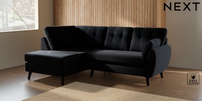 7.2.10 Buy Wilson Buttoned Back Medium Corner Chaise - Left Hand Fine Chenille Easy Clean Black Retro Tapered - Dark from the Seasons online shop Click here to use our website with more accessibility support, for example screen readers