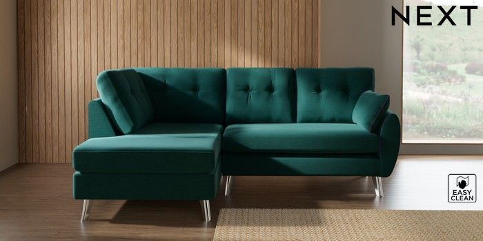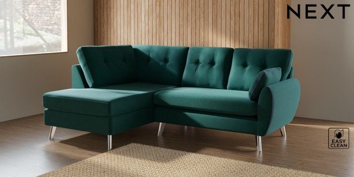 7.3.1 Buy Wilson Buttoned Back Medium Corner Chaise - Left Hand Fine Chenille Easy Clean Dark Juniper Green Metal Tapered - Chrome from the Seasons online shop Click here to use our website with more accessibility support, for example screen readers