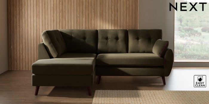 7.3.1 Buy Wilson Buttoned Back Medium Corner Chaise - Left Hand Fine Chenille Easy Clean Dark Moss Green Retro Tapered - Dark Brown from the Seasons online shop Click here to use our website with more accessibility support, for example screen readers