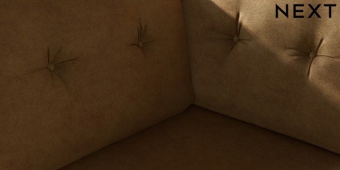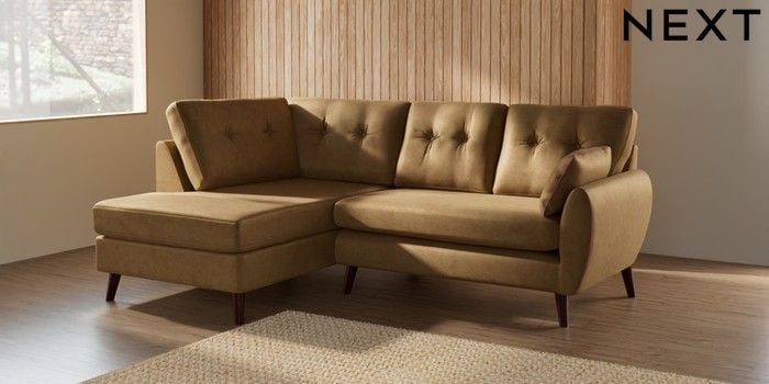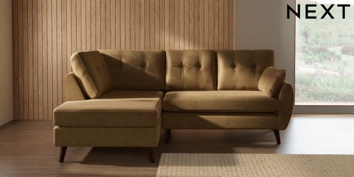 7.3.1 Buy Wilson Buttoned Back Medium Corner Chaise - Left Hand Luxe Chenille Honey Yellow Retro Tapered - Dark Brown from the Seasons online shop Click here to use our website with more accessibility support, for example screen readers