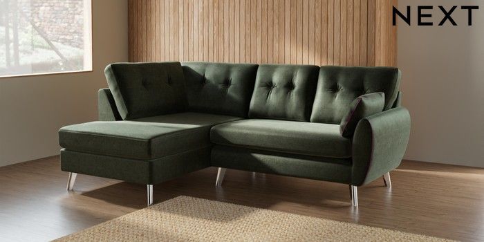 7.3.1 Buy Wilson Buttoned Back Medium Corner Chaise - Left Hand Luxe Chenille Mid Green Metal Tapered - Chrome from the Seasons online shop Click here to use our website with more accessibility support, for example screen readers