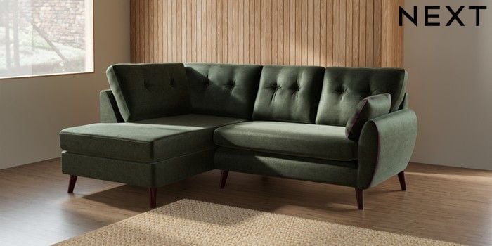 7.2.10 Buy Wilson Buttoned Back Medium Corner Chaise - Left Hand Luxe Chenille Mid Green Retro Tapered - Dark Brown from the Seasons online shop Click here to use our website with more accessibility support, for example screen readers