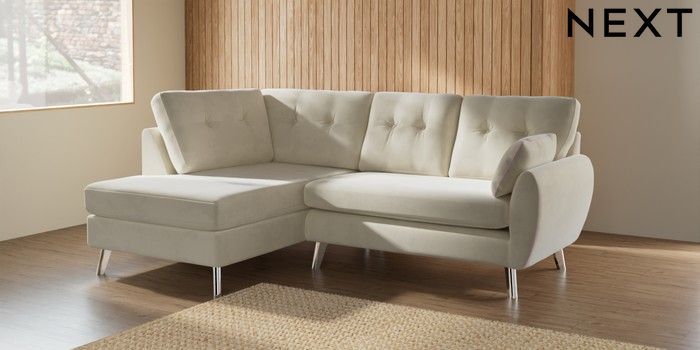 7.2.10 Buy Wilson Buttoned Back Medium Corner Chaise - Left Hand Luxe Chenille Oyster Metal Tapered - Chrome from the Seasons online shop Click here to use our website with more accessibility support, for example screen readers