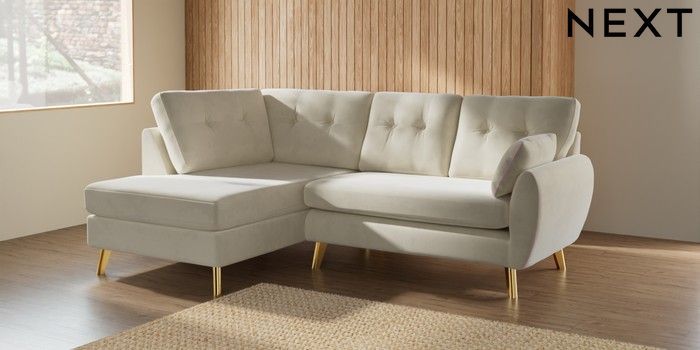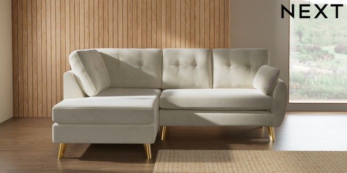7.3.1 Buy Wilson Buttoned Back Medium Corner Chaise - Left Hand Luxe Chenille Oyster Metal Tapered - Gold from the Seasons online shop Click here to use our website with more accessibility support, for example screen readers