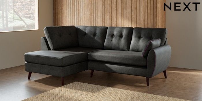 7.3.1 Buy Wilson Buttoned Back Medium Corner Chaise - Left Hand Monza Faux Leather Easy Clean Dark Grey Retro Tapered - Dark Brown from the Seasons online shop Click here to use our website with more accessibility support, for example screen readers