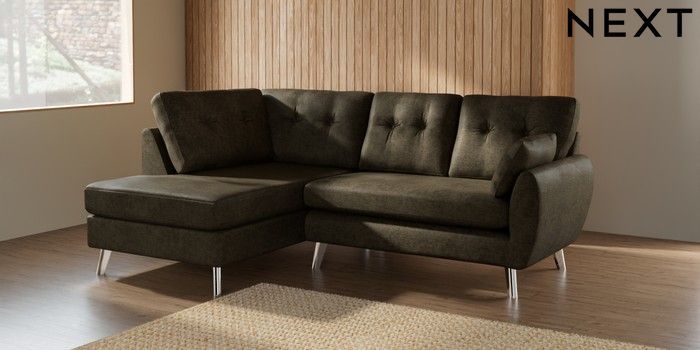7.2.10 Buy Wilson Buttoned Back Medium Corner Chaise - Left Hand Plush Chenille Moss Green Metal Tapered - Chrome from the Seasons online shop Click here to use our website with more accessibility support, for example screen readers