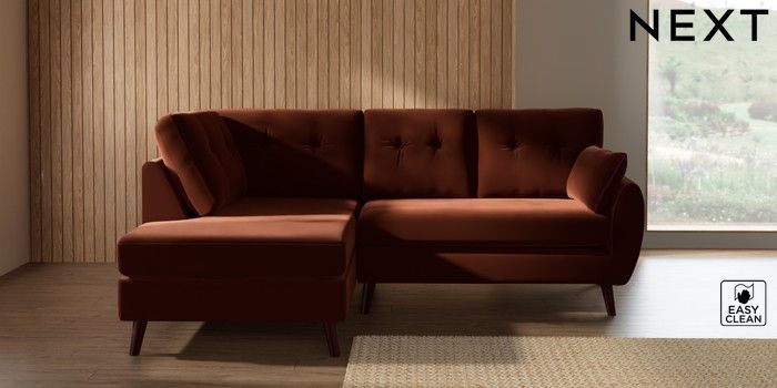 7.3.1 Buy Wilson Buttoned Back Medium Corner Chaise - Left Hand Plush Velvet Easy Clean Ginger Orange Retro Tapered - Dark Brown from the Seasons online shop Click here to use our website with more accessibility support, for example screen readers