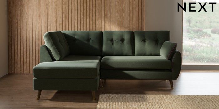 7.3.1 Buy Wilson Buttoned Back Medium Corner Chaise - Left Hand Relaxed Linen Look Dark Green Low Retro Tapered Metal Cap - Mid from the Seasons online shop Click here to use our website with more accessibility support, for example screen readers