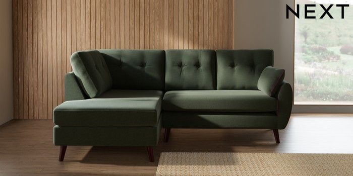 7.3.1 Buy Wilson Buttoned Back Medium Corner Chaise - Left Hand Relaxed Linen Look Dark Green Retro Tapered - Dark Brown from the Seasons online shop Click here to use our website with more accessibility support, for example screen readers