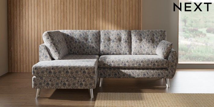 7.3.1 Buy Wilson Buttoned Back Medium Corner Chaise - Left Hand Relaxed Linen Look Print Woodblock Floral Blue Metal Tapered - Chrome from the Seasons online shop
