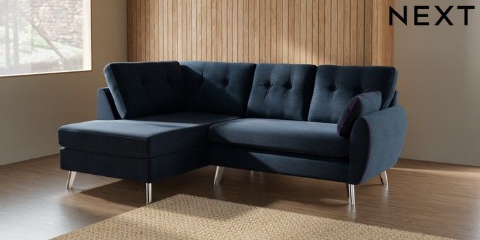 7.2.10 Buy Wilson Buttoned Back Medium Corner Chaise - Left Hand Ripple Chenille Dark Blue Metal Tapered - Chrome from the Seasons online shop Click here to use our website with more accessibility support, for example screen readers