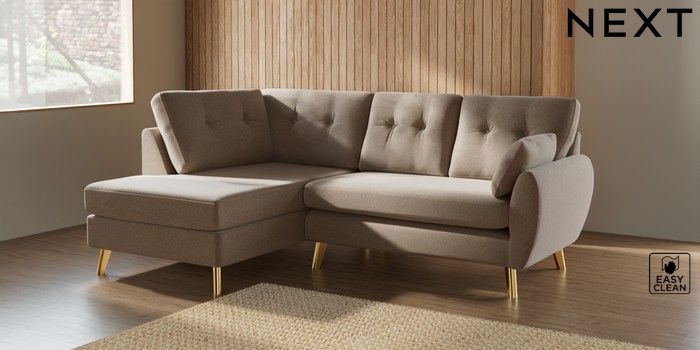 7.3.1 Buy Wilson Buttoned Back Medium Corner Chaise - Left Hand Tweedy Blend Easy Clean Light Dove Natural Metal Tapered - Gold from the Seasons online shop Click here to use our website with more accessibility support, for example screen readers