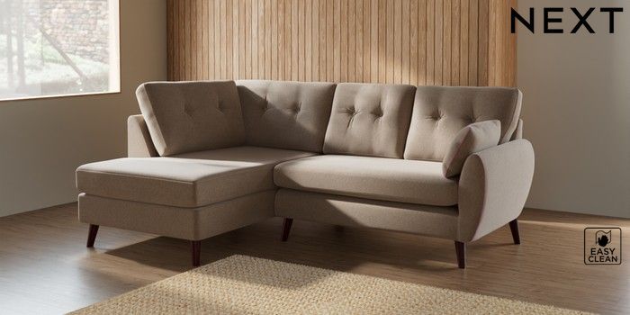 7.3.1 Buy Wilson Buttoned Back Medium Corner Chaise - Left Hand Tweedy Blend Easy Clean Light Dove Natural Retro Tapered - Dark Brown from the Seasons online shop Click here to use our website with more accessibility support, for example screen readers