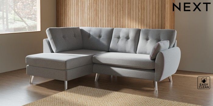 7.3.1 Buy Wilson Buttoned Back Medium Corner Chaise - Left Hand Tweedy Blend Easy Clean Light Silver Grey Metal Tapered - Chrome from the Seasons online shop Click here to use our website with more accessibility support, for example screen readers