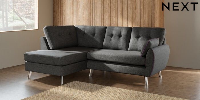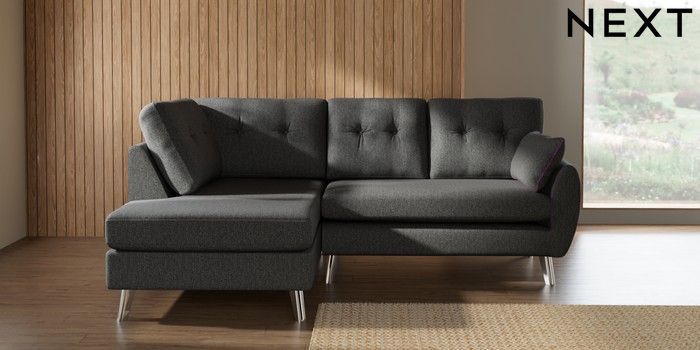 7.3.1 Buy Wilson Buttoned Back Medium Corner Chaise - Left Hand Tweedy Chenille Dark Grey Metal Tapered - Chrome from the Seasons online shop Click here to use our website with more accessibility support, for example screen readers