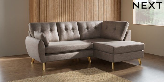 7.3.1 Buy Wilson Buttoned Back Medium Corner Chaise - Right Hand Boucle Chenille Light Natural Metal Tapered - Gold from the Seasons online shop Click here to use our website with more accessibility support, for example screen readers