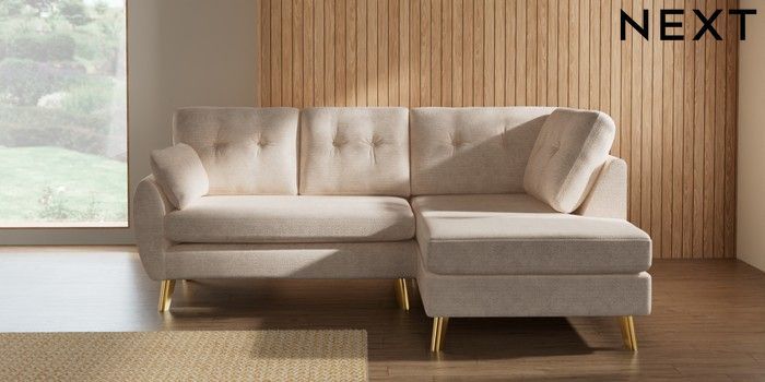 7.3.1 Buy Wilson Buttoned Back Medium Corner Chaise - Right Hand Boucle Chenille Oyster Metal Tapered - Gold from the Seasons online shop Click here to use our website with more accessibility support, for example screen readers