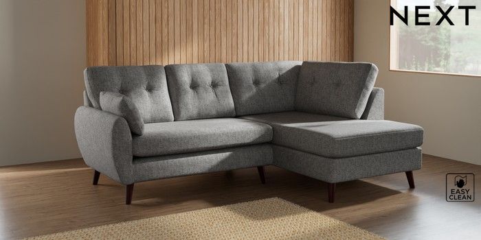 7.3.1 Buy Wilson Buttoned Back Medium Corner Chaise - Right Hand Chunky Boucle Easy Clean Light Grey Retro Tapered - Dark Brown from the Seasons online shop Click here to use our website with more accessibility support, for example screen readers