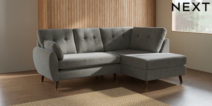 7.2.10 Buy Wilson Buttoned Back Medium Corner Chaise - Right Hand Chunky Chenille Light Grey Low Retro Tapered Metal Cap - Mid from the Seasons online shop Click here to use our website with more accessibility support, for example screen readers