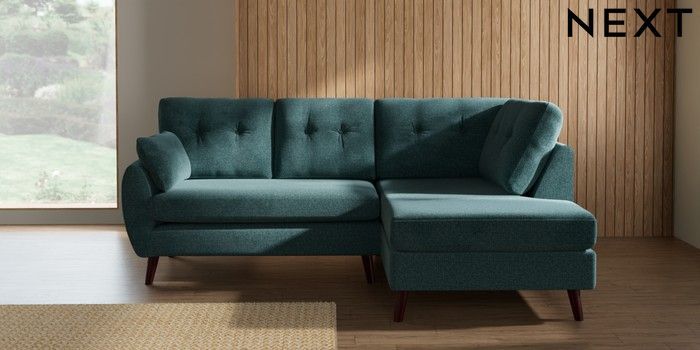 7.3.1 Buy Wilson Buttoned Back Medium Corner Chaise - Right Hand Chunky Chenille Mid Teal Green Retro Tapered - Dark Brown from the Seasons online shop Click here to use our website with more accessibility support, for example screen readers