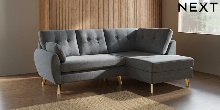 7.3.1 Buy Wilson Buttoned Back Medium Corner Chaise - Right Hand Chunky Marl Mid Grey Metal Tapered - Gold from the Seasons online shop Click here to use our website with more accessibility support, for example screen readers