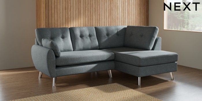 7.3.1 Buy Wilson Buttoned Back Medium Corner Chaise - Right Hand Chunky Weave Mid Blue Metal Tapered - Chrome from the Seasons online shop Click here to use our website with more accessibility support, for example screen readers