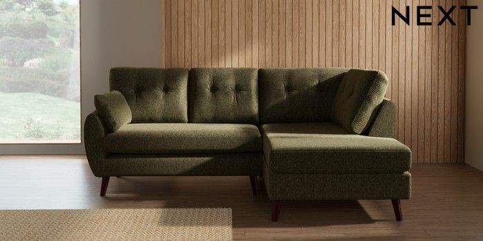 7.3.1 Buy Wilson Buttoned Back Medium Corner Chaise - Right Hand Cotswold Chenille Dark Green Retro Tapered - Dark Brown from the Seasons online shop Click here to use our website with more accessibility support, for example screen readers