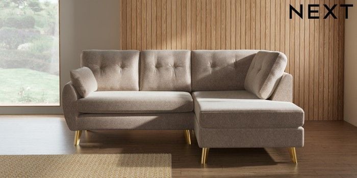 7.3.1 Buy Wilson Buttoned Back Medium Corner Chaise - Right Hand Cotswold Chenille Light Natural Metal Tapered - Gold from the Seasons online shop Click here to use our website with more accessibility support, for example screen readers