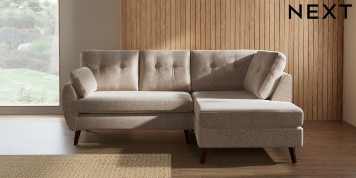 7.3.1 Buy Wilson Buttoned Back Medium Corner Chaise - Right Hand Cotswold Chenille Light Natural Retro Tapered - Dark Brown from the Seasons online shop Click here to use our website with more accessibility support, for example screen readers