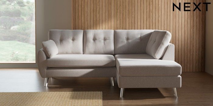 7.3.1 Buy Wilson Buttoned Back Medium Corner Chaise - Right Hand Cotswold Chenille Oyster Metal Tapered - Chrome from the Seasons online shop Click here to use our website with more accessibility support, for example screen readers