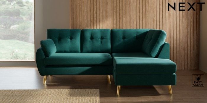 7.3.1 Buy Wilson Buttoned Back Medium Corner Chaise - Right Hand Fine Chenille Easy Clean Dark Juniper Green Metal Tapered - Gold from the Seasons online shop Click here to use our website with more accessibility support, for example screen readers