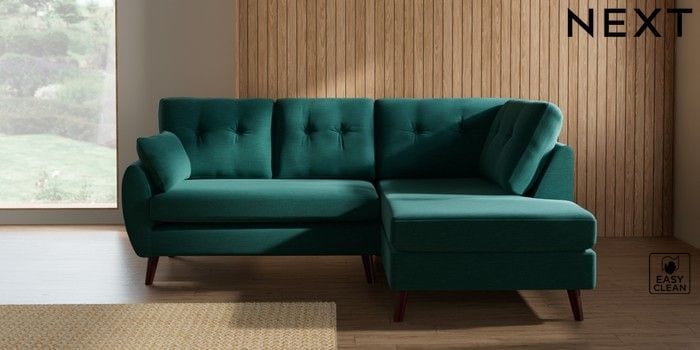 7.3.1 Buy Wilson Buttoned Back Medium Corner Chaise - Right Hand Fine Chenille Easy Clean Dark Juniper Green Retro Tapered - Dark Brown from the Seasons online shop Click here to use our website with more accessibility support, for example screen readers