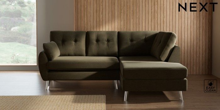 7.3.1 Buy Wilson Buttoned Back Medium Corner Chaise - Right Hand Fine Chenille Easy Clean Dark Moss Green Metal Tapered - Chrome from the Seasons online shop Click here to use our website with more accessibility support, for example screen readers