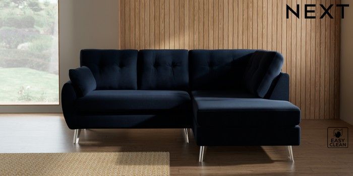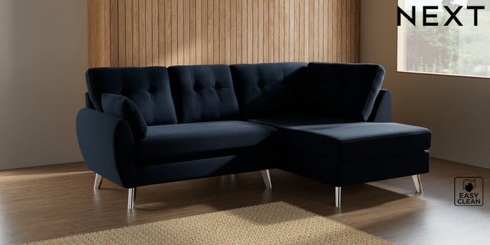 7.3.1 Buy Wilson Buttoned Back Medium Corner Chaise - Right Hand Fine Chenille Easy Clean Dark Navy Blue Metal Tapered - Chrome from the Seasons online shop Click here to use our website with more accessibility support, for example screen readers