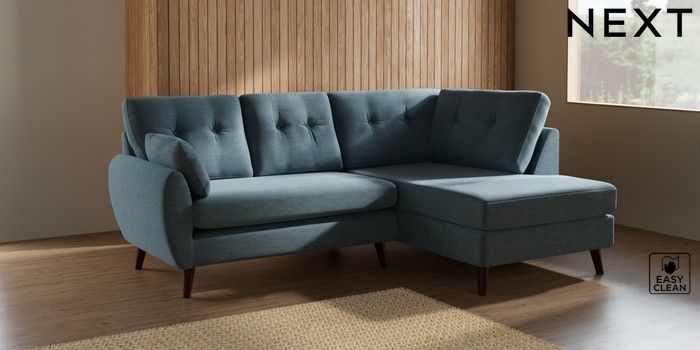 7.3.1 Buy Wilson Buttoned Back Medium Corner Chaise - Right Hand Fine Chenille Easy Clean Mid Blue Retro Tapered - Dark Brown from the Seasons online shop Click here to use our website with more accessibility support, for example screen readers