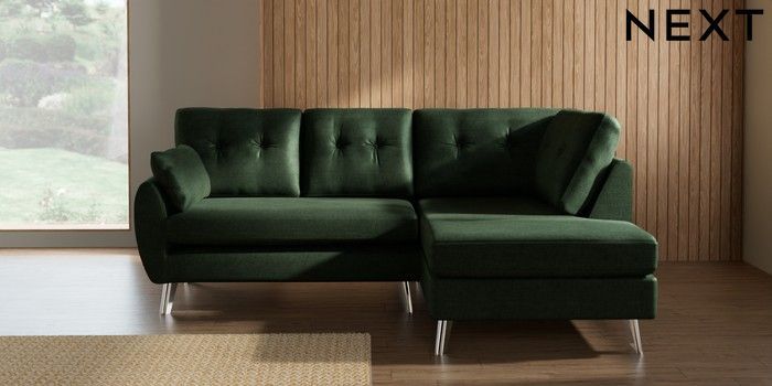 7.3.1 Buy Wilson Buttoned Back Medium Corner Chaise - Right Hand Luxe Chenille Dark Green Metal Tapered - Chrome from the Seasons online shop Click here to use our website with more accessibility support, for example screen readers