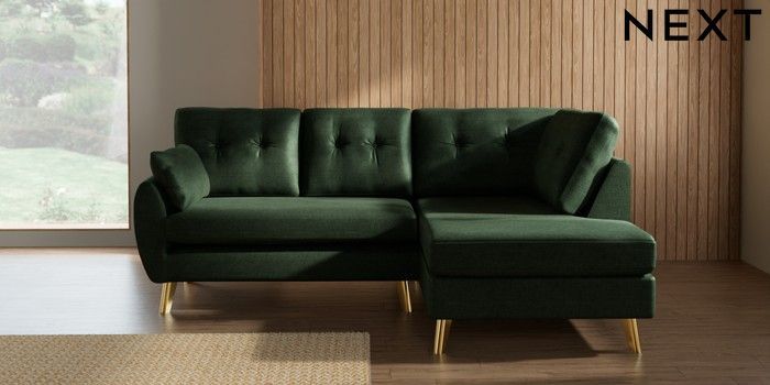 7.3.1 Buy Wilson Buttoned Back Medium Corner Chaise - Right Hand Luxe Chenille Dark Green Metal Tapered - Gold from the Seasons online shop Click here to use our website with more accessibility support, for example screen readers