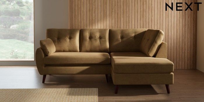 7.3.1 Buy Wilson Buttoned Back Medium Corner Chaise - Right Hand Luxe Chenille Honey Yellow Retro Tapered - Dark Brown from the Seasons online shop Click here to use our website with more accessibility support, for example screen readers