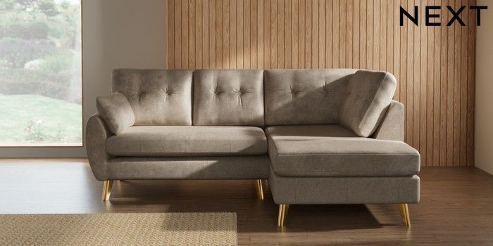 7.3.1 Buy Wilson Buttoned Back Medium Corner Chaise - Right Hand Plush Chenille Light Natural Metal Tapered - Gold from the Seasons online shop Click here to use our website with more accessibility support, for example screen readers