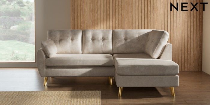 7.3.1 Buy Wilson Buttoned Back Medium Corner Chaise - Right Hand Plush Chenille Oyster Metal Tapered - Gold from the Seasons online shop Click here to use our website with more accessibility support, for example screen readers