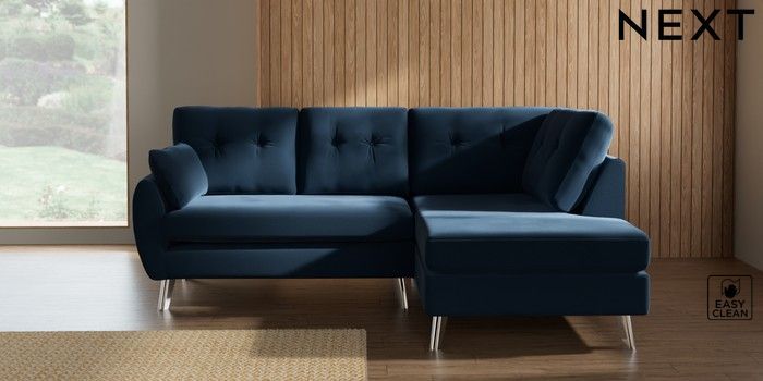 7.3.1 Buy Wilson Buttoned Back Medium Corner Chaise - Right Hand Plush Velvet Easy Clean Airforce Blue Metal Tapered - Chrome from the Seasons online shop Click here to use our website with more accessibility support, for example screen readers