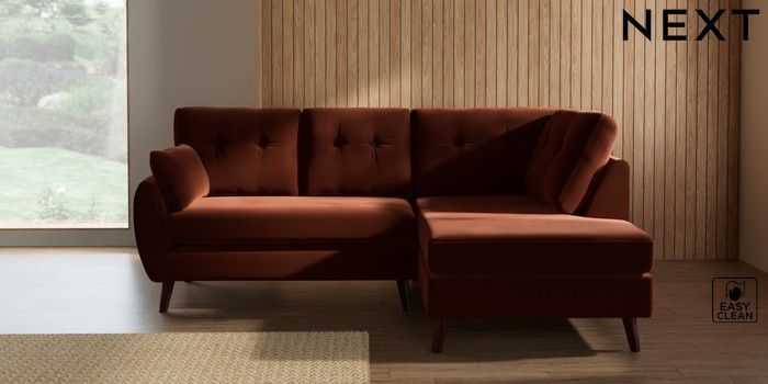 7.3.1 Buy Wilson Buttoned Back Medium Corner Chaise - Right Hand Plush Velvet Easy Clean Ginger Orange Retro Tapered - Dark Brown from the Seasons online shop Click here to use our website with more accessibility support, for example screen readers
