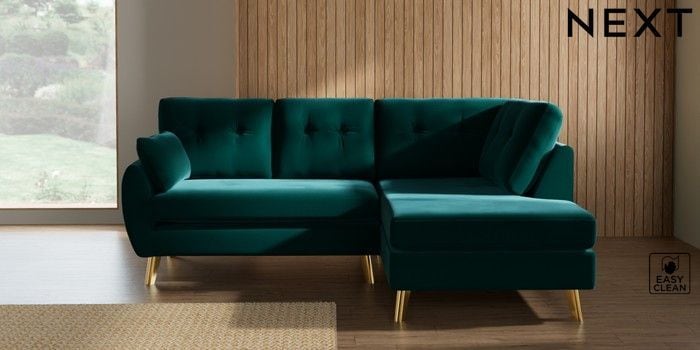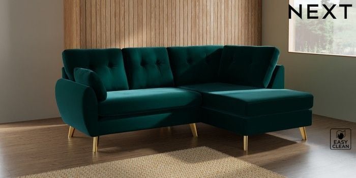 7.3.1 Buy Wilson Buttoned Back Medium Corner Chaise - Right Hand Plush Velvet Easy Clean Juniper Green Metal Tapered - Gold from the Seasons online shop Click here to use our website with more accessibility support, for example screen readers