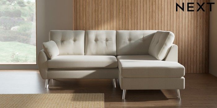 7.3.1 Buy Wilson Buttoned Back Medium Corner Chaise - Right Hand Relaxed Linen Look Oyster Metal Tapered - Chrome from the Seasons online shop Click here to use our website with more accessibility support, for example screen readers