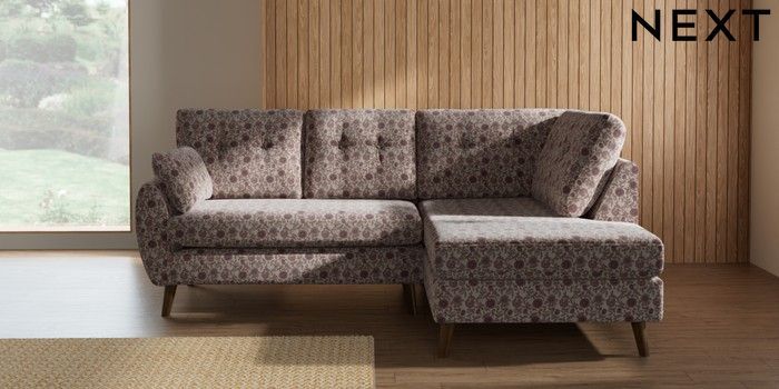 7.3.1 Buy Wilson Buttoned Back Medium Corner Chaise - Right Hand Relaxed Linen Look Print Woodblock Floral Print Pink Retro Tapered - Mid from the Seasons online shop