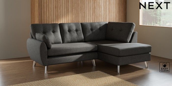 7.3.1 Buy Wilson Buttoned Back Medium Corner Chaise - Right Hand Tweedy Blend Easy Clean Dark Grey Metal Tapered - Chrome from the Seasons online shop Click here to use our website with more accessibility support, for example screen readers