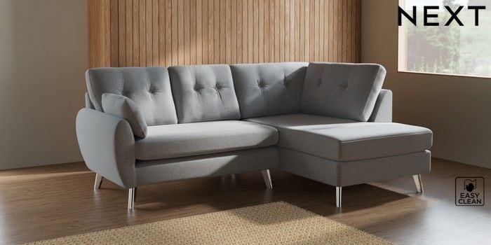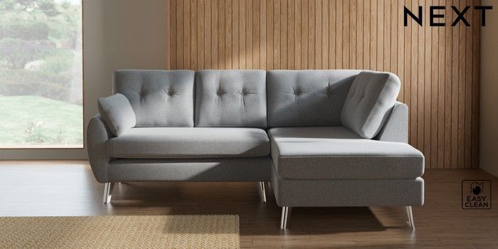 7.3.1 Buy Wilson Buttoned Back Medium Corner Chaise - Right Hand Tweedy Blend Easy Clean Light Silver Grey Metal Tapered - Chrome from the Seasons online shop Click here to use our website with more accessibility support, for example screen readers