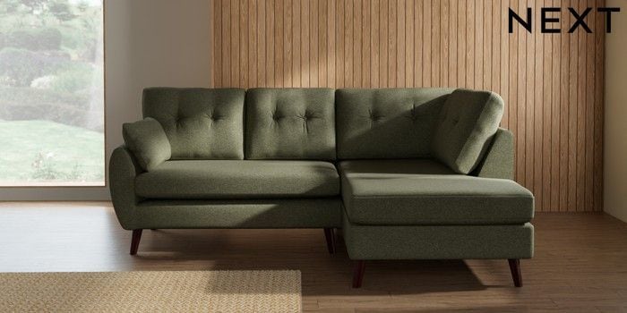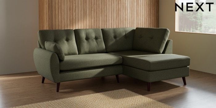 7.3.1 Buy Wilson Buttoned Back Medium Corner Chaise - Right Hand Tweedy Chenille Mid Moss Green Retro Tapered - Dark Brown from the Seasons online shop Click here to use our website with more accessibility support, for example screen readers