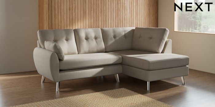 7.3.1 Buy Wilson Buttoned Back Medium Corner Chaise - Right Hand Tweedy Chenille Oyster Metal Tapered - Chrome from the Seasons online shop Click here to use our website with more accessibility support, for example screen readers